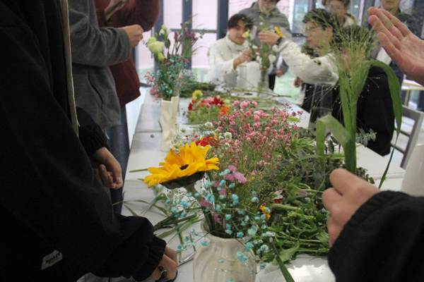其后的插花环节活动现场布置雅致,玫瑰、洋牡丹、尤加利叶等十余种新鲜花材色泽鲜亮,花香萦绕,营造出浓厚的传统文化氛围。大家手持花枝悉心修剪、巧妙组合,将对生活的热爱与创意融入作品,一束束造型别致、意境悠远的花艺作品渐次成型,每一件都承载着独特的审美表达。