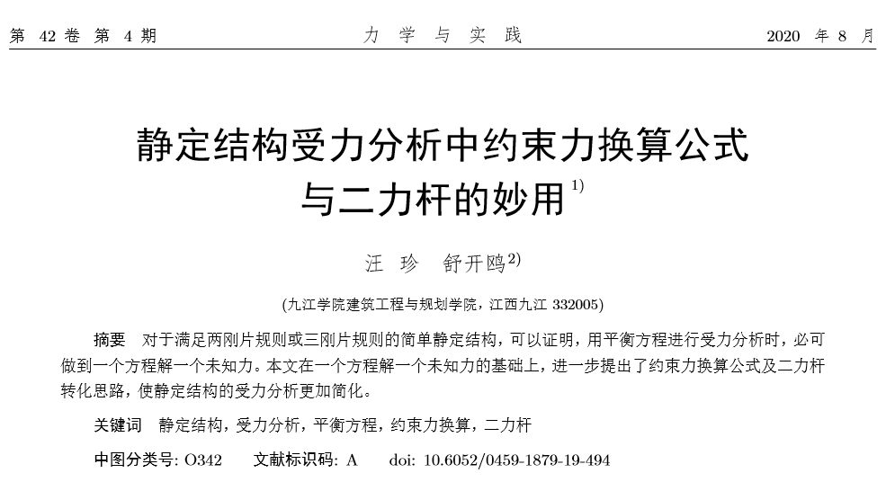 汪珍同学在学习专业核心课程《结构力学》时,对课程内容产生了浓厚兴趣,全身心投入到课程的学习和钻研中。通过深入研究静定结构的受力规律,她发现并简明地证明了凡是满足广义铰接三角形几何构造规则的静定结构,在受力分析时必然可以做到列一个平衡方程就能求解一个约束力,从而避免了求解复杂的方程组。更重要的是,她进一步提出了能极大方便计算这一类静定结构约束力的换算公式与二力杆方法。该论文的署名单位为九江学院,汪珍为第一作者,指导老师舒开鸥为通讯作者。