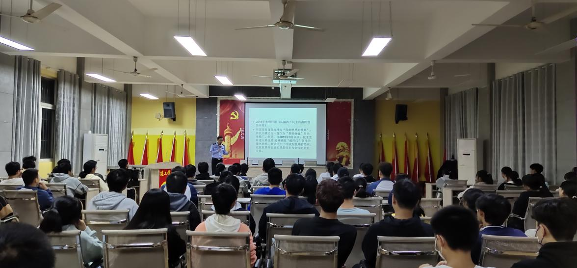公安机关人员以许多真实案例向同学们介绍了三个方面的知识。首先介绍了颜色革命,并以乌克兰为例,让同学们了解到其中巨大的危害,警示学生要预防好颜色革命。其次介绍了关于宗教信仰的相关问题,要预防不良宗教渗透学生身心。最后介绍了关于教育方面的警觉性,并列举了一些课本上涉嫌低俗,传播不良价值观的案例,希望学生们可以做好相应的教育渗透防范措施。