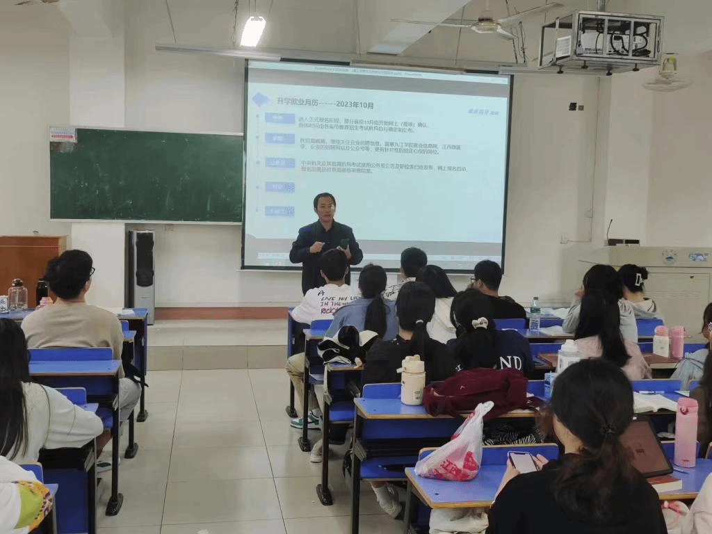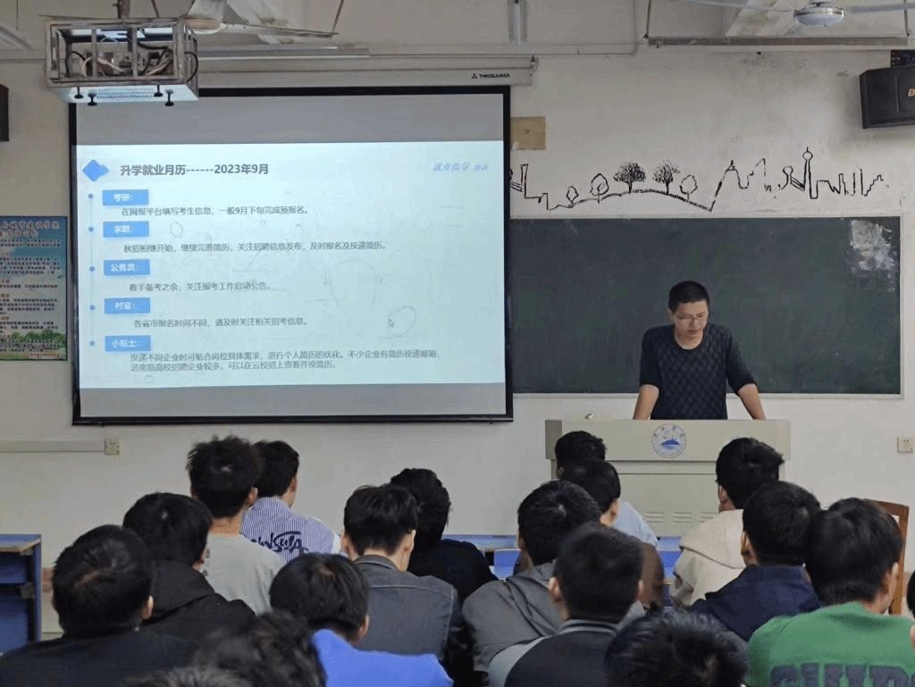 各毕业班积极响应活动,在班主任的带领下纷纷开展以“升学就业月历”、“大学生就业形势分析”、“大学生就业准备”为主要内容的相关班会,向即将迎来毕业的大学生们介绍考研、考公等相关知识,驱散他们对未来的迷茫,也为他们亮起前进路上的灯光。